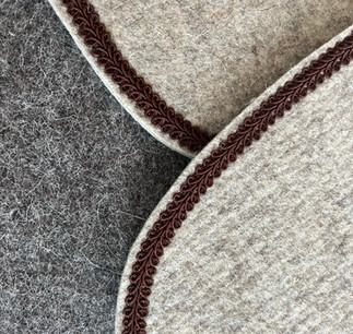100% Natur: Ich wähle stets den am wenigsten behandelten Filz. Die Wolle wird vor dem Filzen normalerweise gewaschen und mit Schwefelsäure karbonisiert. Das tut weder der Wolle noch der Umwelt gut und ist für den Einsatz am Pferd komplett unnötig, weil es das wertvolle Wollfett reduziert. Ich verwende nur unkarbonisierten Filz. Mein Standardfilz ist ungefärbt, aber natürlich sind auch bunte Filze möglich.