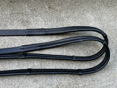 Trensenzügel aus weichem Nappaleder, mit Stegen und Martingalschieber ausgestattet. Mit schnellem Hakenverschluss an den Enden und einer Schnalle in der Mitte.